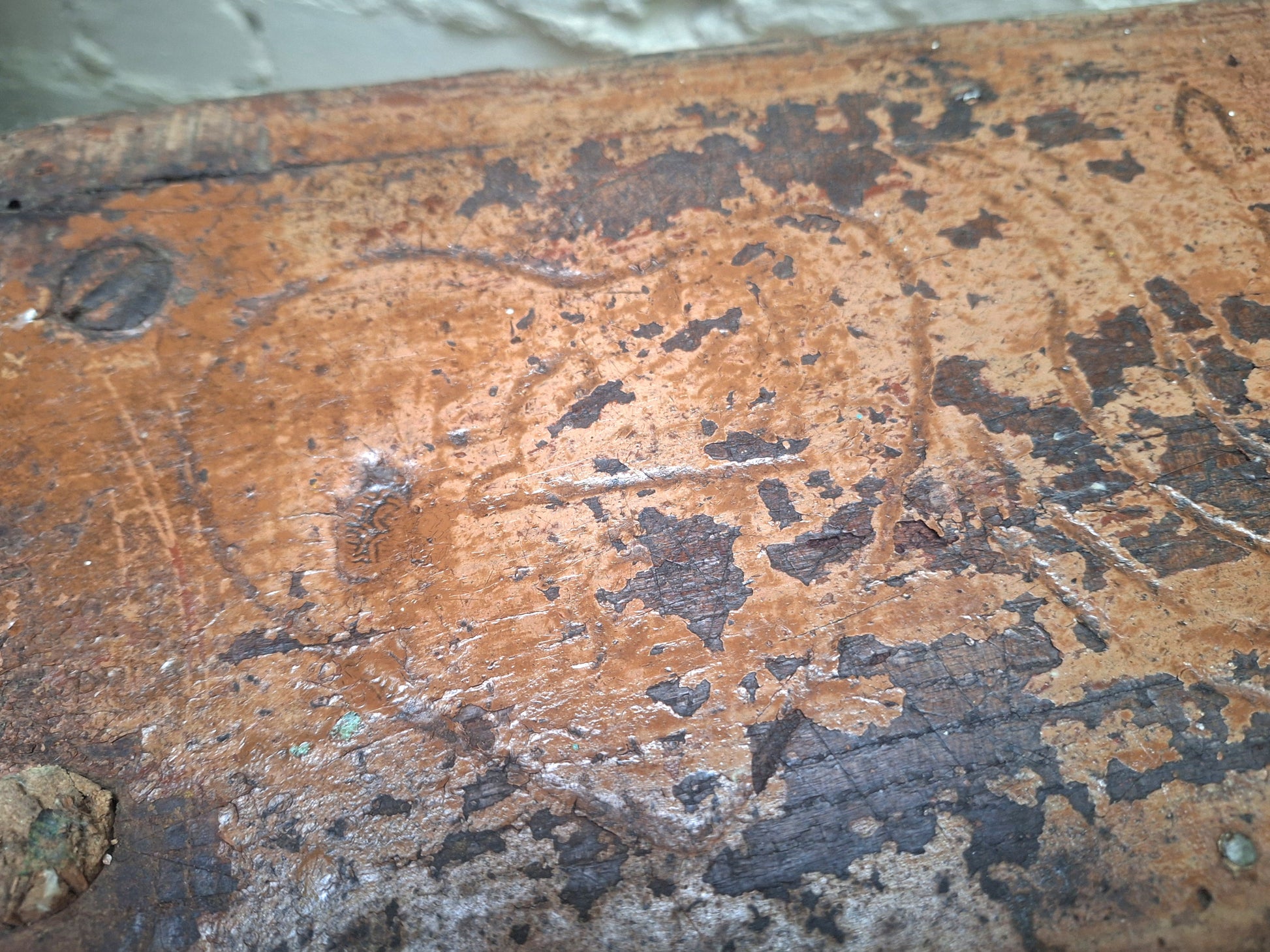 This gorgeous antique stool has carvings in the seat, possibly 'witch marks' or pagan symbols to ward off evil spirits.