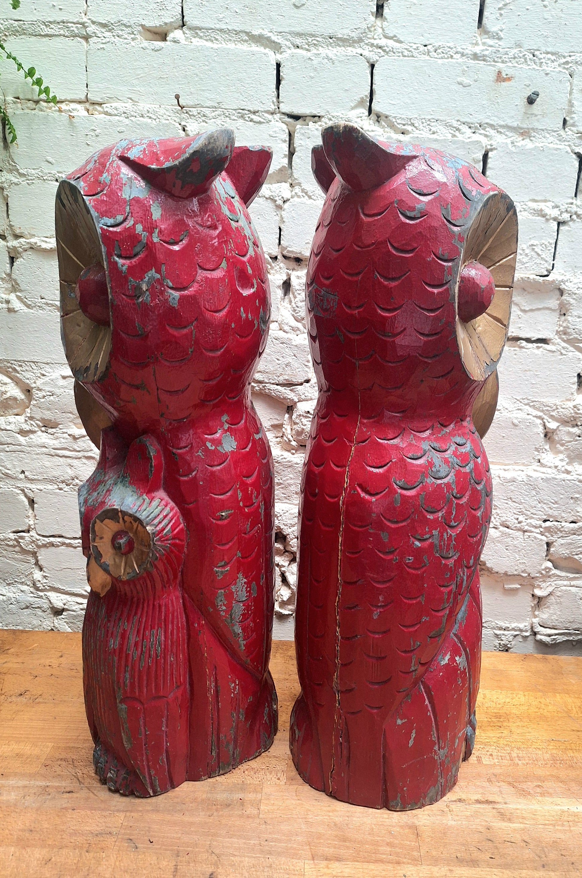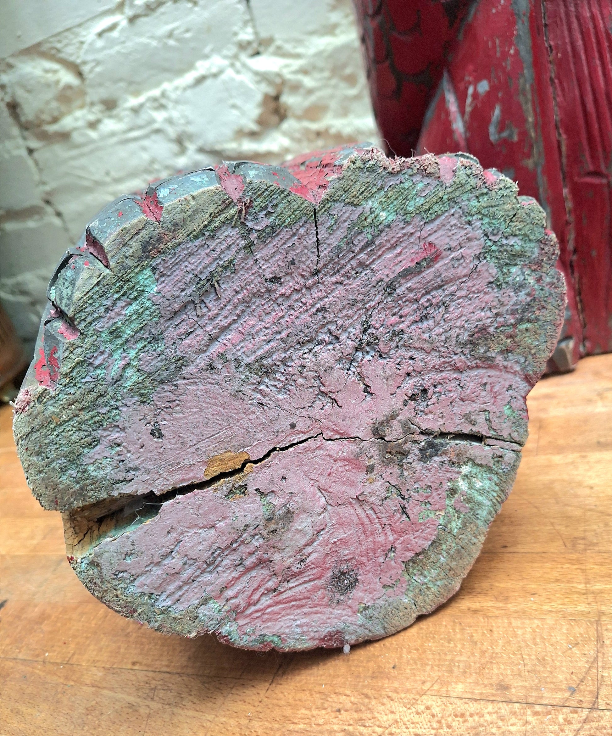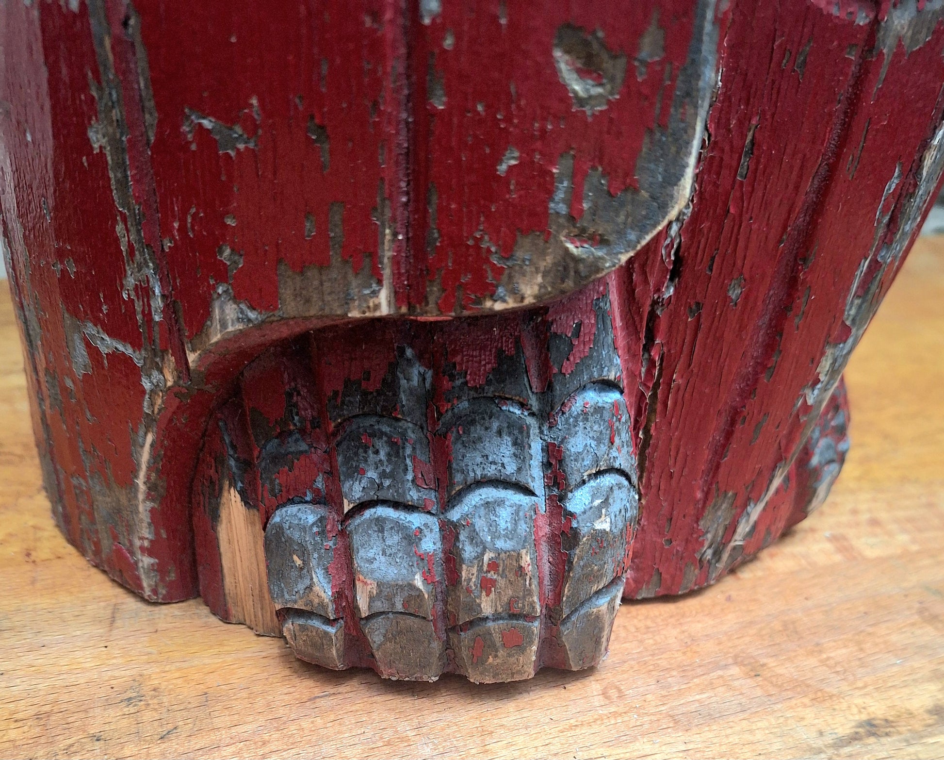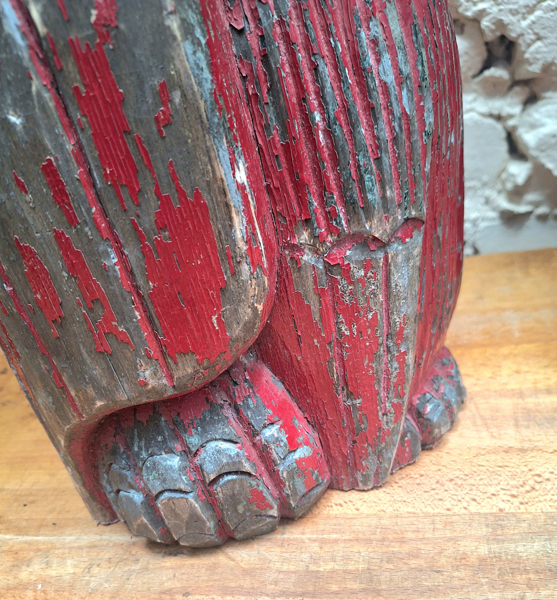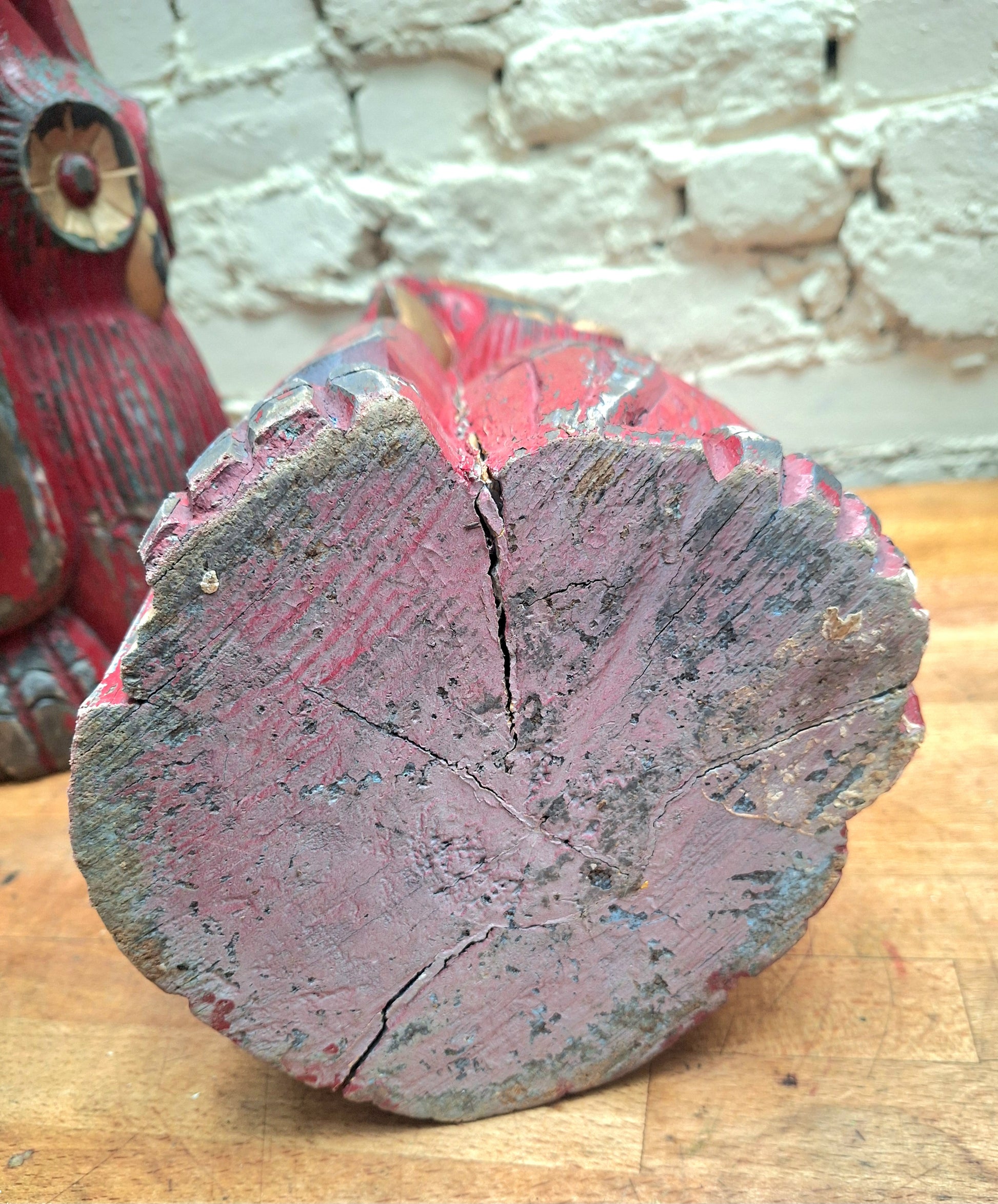 Carved from one piece of wood with red and gold (now lovely and chippy) paint.